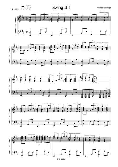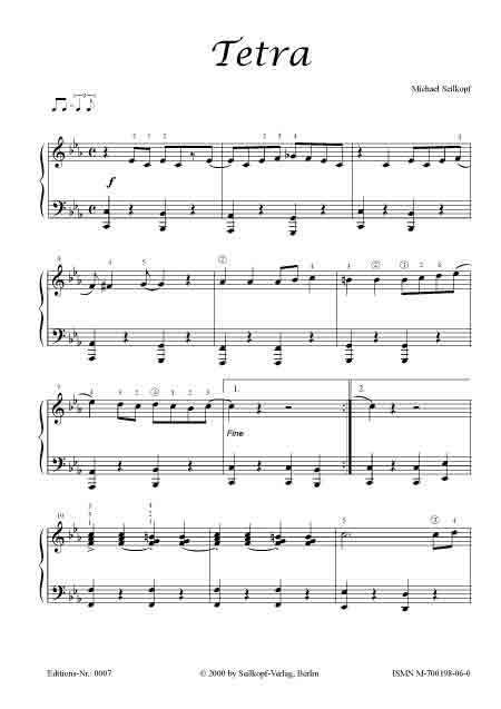 | Tetra (aus: 10 "mittelschwere" Klavierstücke) Das Stück verdankt seinen Namen den abwärtsstrebenden, oktavverstärkten Tetrachorden der linken Hand. Es wird im Swing-Rhythmus (ternär) gespielt. (Mit Fingersätzen versehen) [für fortgeschrittene Anfänger; 2 Seiten; von Michael Seilkopf] |