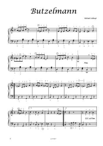 | Butzelmann (aus: 10 "mittelschwere" Klavierstücke) Im Grunde ein nicht allzu schwieriger Raggtime, der große Sprünge der linken Hand zu vermeiden sucht. (Mit Fingersätzen versehen) [für fortgeschrittene Anfänger; 1 Seite; von Michael Seilkopf] |