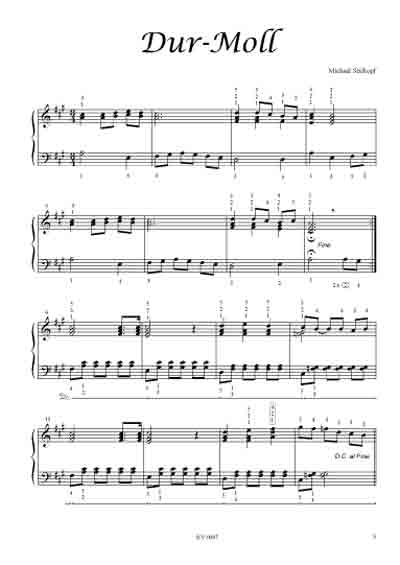 und Moll (aus: 10 "mittelschwere" Klavierstücke) Bei diesem kleinen Stück prallen die beiden Tongeschlechter hart aufeinander. Der erste Teil (8 Takte) bewegt sich im strahlenden A-Dur, während der zweite Teil (ebenfalls 8 Takte) ohne viel Umschweife in fis-moll operiert. (Mit Fingersätzen versehen) [für fortgeschrittene Anfänger; 1 Seite; von Michael Seilkopf] |
