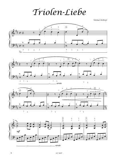 | Triolen-Liebe (aus: 10 "mittelschwere" Klavierstücke) Es handelt sich hierbei um ein rhythmisch nicht ganz einfaches, im ersten Teil melancholisches und im Mittelteil aufbrausendes Stück, das aber - behutsam gespielt - zu verzaubern weiss. (Mit Fingersätzen versehen) [für leicht Fortgeschrittene; 2 Seiten; von Michael Seilkopf] |