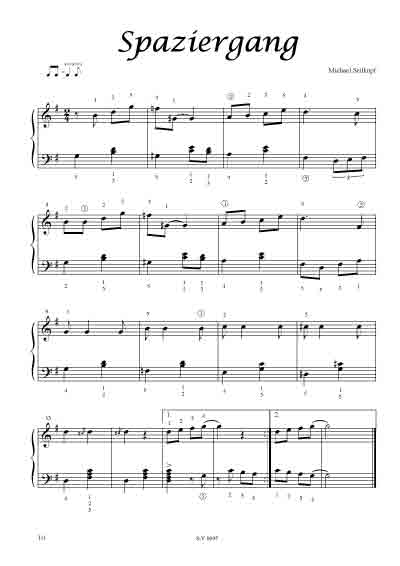 | Spaziergang (aus: 10 "mittelschwere" Klavierstücke) Dieses Raggtime-ähnliche Stück ist in der Melodieführung recht eigenwillig, versteht es aber doch dank seines spröden Charmes zu begeistern. (Mit Fingersätzen versehen) [für fortgeschrittene Anfänger; 1 Seite; von Michael Seilkopf] |