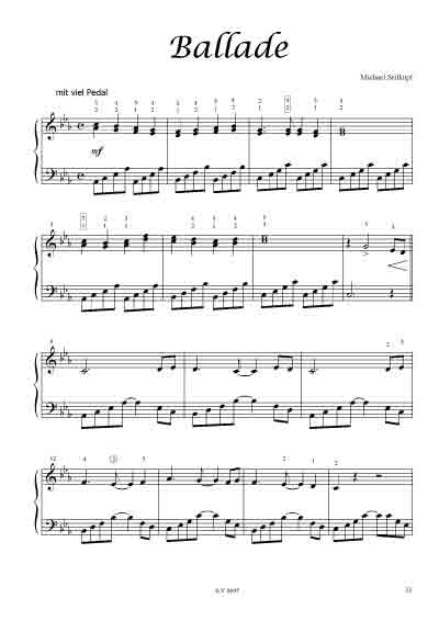 | Ballade (aus: 10 "mittelschwere" Klavierstücke) Das längste der zehn zusammengehörenden Klavierstücke. Es besitzt eine recht eingängige Melodie im ersten Teil und einen etwas schwierigen entfernt an Bach erinnernden Mittelteil. Auffällig anders und interessant aufgrund der einsetzenden Modulationen klingt der Schluß des Stückes. (Mit Fingersätzen versehen) [für leicht Fortgeschrittene; 5 Seiten; von Michael Seilkopf] |