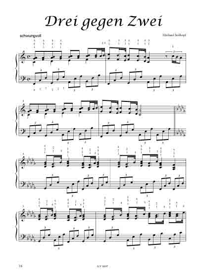 gegen Zwei (aus: 10 "mittelschwere" Klavierstücke) Während die linke Hand durchgehend Triolen spielt, gilt es, mit der rechten Hand unbeirrt mit (binären) Achteln dagegen zu halten. (Mit Fingersätzen versehen) [für Fortgeschrittene; 2 Seiten; von Michael Seilkopf] |