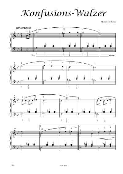 | Konfusions-Walzer (aus: 10 "mittelschwere" Klavierstücke) Recht konfus springt dieser Walzer durch die Tonarten, wobei sich eine eingehende Melodie dennoch durchzusetzen weiss. (Mit Fingersätzen versehen) [für leicht Fortgeschrittene; 3 Seiten; von Michael Seilkopf] |