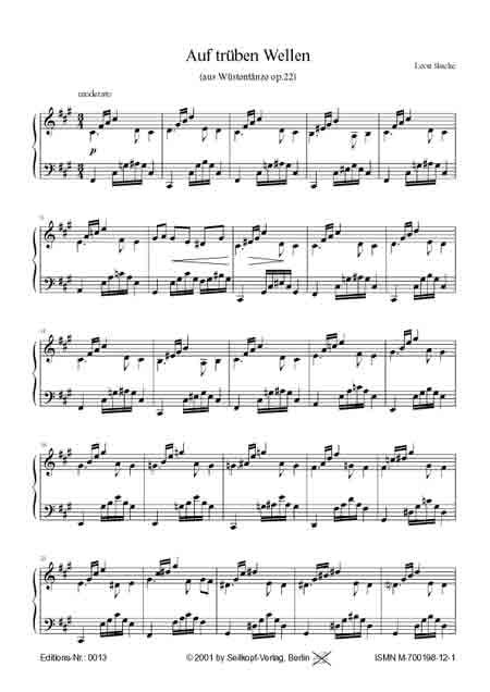 trüben Wellen (aus: "Sechs Klavierstücke") Dieses Klavierstück des jungen Komponisten Leon Buche stammt aus "Wüstentänze" op.22 und ist, wie beinahe alle seine Stücke, aufgrund des recht hoch angesetzten Schwierigkeitsgrad nur für fortgeschrittene Klavierspieler geeignet. Diese werden dafür mit bezaubernden Melodien und mitreißenden Rhythmen belohnt. [für Fortgeschrittene und Profis; 4 Seiten; von Leon Buche] |