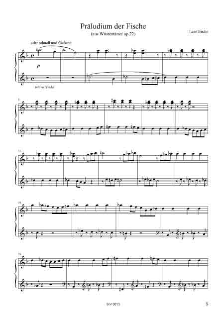 der Fische (aus: "Sechs Klavierstücke") Dieses Klavierstück des jungen Komponisten Leon Buche stammt aus "Wüstentänze" op.22 und ist, wie beinahe alle seine Stücke, aufgrund des recht hoch angesetzten Schwierigkeitsgrad nur für fortgeschrittene Klavierspieler geeignet. Diese werden dafür mit bezaubernden Melodien und mitreißenden Rhythmen belohnt. [für Fortgeschrittene und Profis; 5 Seiten; von Leon Buche] |