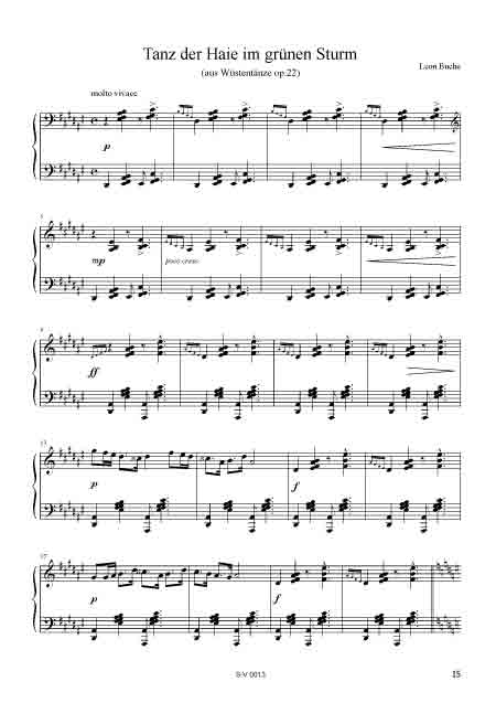 der Haie im grünen Sturm (aus: "Sechs Klavierstücke") Dieses Klavierstück des jungen Komponisten Leon Buche stammt aus "Wüstentänze" op.22 und ist, wie beinahe alle seine Stücke, aufgrund des recht hoch angesetzten Schwierigkeitsgrad nur für fortgeschrittene Klavierspieler geeignet. Diese werden dafür mit bezaubernden Melodien und mitreißenden Rhythmen belohnt. [für Fortgeschrittene und Profis; 4 Seiten; von Leon Buche] |