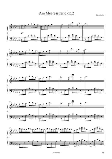 Meeresstrand op.2 (aus: "Sechs Klavierstücke") Dieses Klavierstück des jungen Komponisten Leon Buche ist, wie beinahe alle seine Stücke, aufgrund des recht hoch angesetzten Schwierigkeitsgrad nur für fortgeschrittene Klavierspieler geeignet. Diese werden dafür mit bezaubernden Melodien und mitreißenden Rhythmen belohnt. [für Fortgeschrittene und Profis; 7 Seiten; von Leon Buche] |