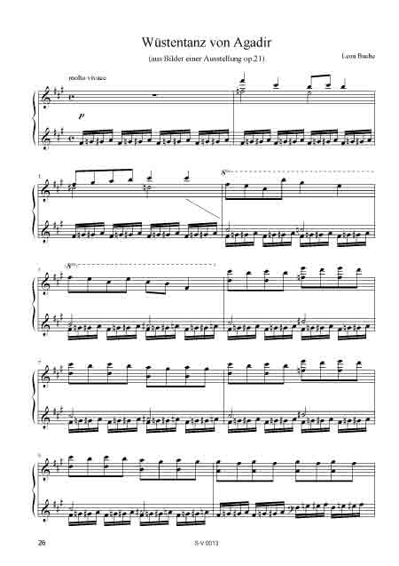 von Agadir (aus: "Sechs Klavierstücke") Dieses Klavierstück des jungen Komponisten Leon Buche stammt aus "Bilder einer Ausstellung" op.21 und ist, wie beinahe alle seine Stücke, aufgrund des recht hoch angesetzten Schwierigkeitsgrad nur für fortgeschrittene Klavierspieler geeignet. Diese werden dafür mit bezaubernden Melodien und mitreißenden Rhythmen belohnt. [für Fortgeschrittene und Profis; 6 Seiten; von Leon Buche] |