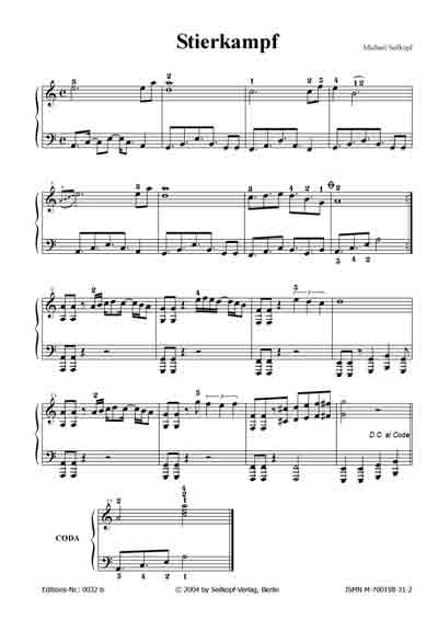| Stierkampf (aus: "15 kleine Klavierereien") Sehr rhythmisches zweitieliges Stück. Der erste Teil ist von einem vorantreibenden Bassmotiv geprägt. im zweiten Teil vollführt die rechte Hand kurze solistische Einwürfe. [für leicht Fortgeschrittene; 1 Seite; von Michael Seilkopf] |