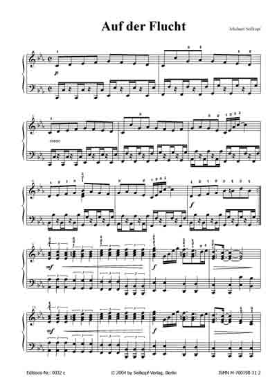 der Flucht (aus: "15 kleine Klavierereien") Auch dieses Stück ist recht rhythmisch. Die linke Hand trainiert hier das Oktavspiel in Unabhängigkeit der rechten Hand. [für leicht Fortgeschrittene; 2 Seiten; von Michael Seilkopf] |