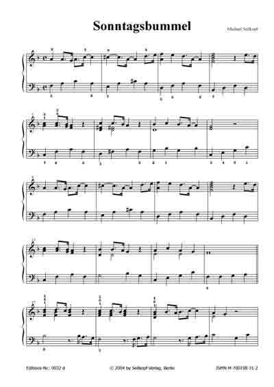 | Sonntagsbummel (aus: "15 kleine Klavierereien") Ein unbeschwertes Stück, dessen Melodie in der rechten Hand sorglos dahinplätschert, während die linke Hand mit gebrochenen Akkorden die rhythmische Basis bildet. [für Anfänger und leicht Fortgeschrittene; 2 Seiten; von Michael Seilkopf] |