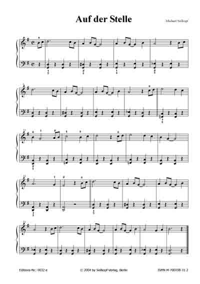der Stelle (aus: "15 kleine Klavierereien") Im ersten Teil bewegt sich die ruhige Melodie in einem Fünftonraum, der erst im zweiten Teil ein wenig erweitert wird. Die linke Hand kommt im ganzen Stück regelmäßig und ausschließlich auf den Zählzeiten zwei und vier zum Einsatz. [für Anfänger; 1 Seite; von Michael Seilkopf] |