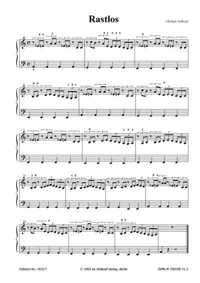 | Rastlos (aus: "15 kleine Klavierereien") Auffällig sind in diesem Stück die gleichmäßig repetierenden Basstöne und die zerrissen wirkende Melodie. Ist das Grundmotiv erst einmal rhythmisch verstanden, so fällt der Rest des Stücks nicht weiter schwer. [für leicht Fortgeschrittene; 1 Seite; von Michael Seilkopf] |