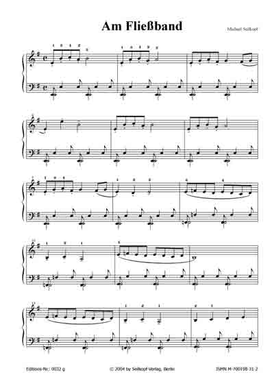Fließband (aus: "15 kleine Klavierereien") Wie der Titel bereits andeutet, wird das Stück möglichst mechanisch (vor allem in der linken Hand) gespielt. [für Anfänger; 2 Seiten; von Michael Seilkopf] |