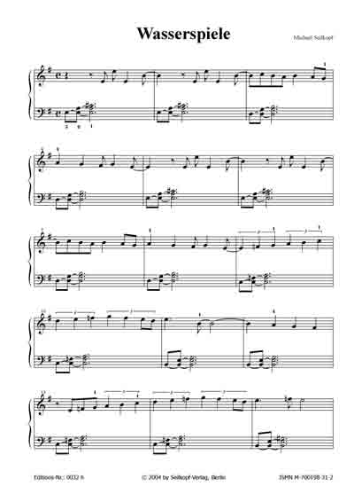 | Wasserspiele (aus: "15 kleine Klavierereien") Die linke Hand deutet mit ihren gebrochenen Akkorden einen leichten Wellenschlag an, wovon sich die rechte Hand mit ihren Synkopen und Triolen stark abhebt. Es wird besonders das unabhängige Spiel beider Hände trainiert. [für leicht Fortgeschrittene; 2 Seiten; von Michael Seilkopf] |