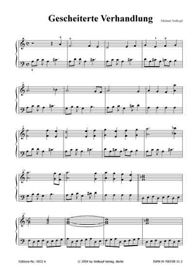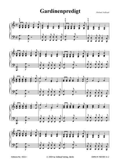 | Gardinenpredigt (aus: "15 kleine Klavierereien") Die Repetitionen in der rechten Hand sowie der harte, unerbittliche Rhythmus der linken Hand erzeugen eine aufgewühlte Atmosphäre, die im Mittelteil für kurze Zeit eine etwas freundlichere - spielerisch allerdings recht anspruchsvolle - Gestalt erhält; nur um anschließend wieder in den anfangs angeschlagenen Tonfall zurückzufallen. [für leicht Fortgeschrittene; 3 Seiten; von Michael Seilkopf] |
