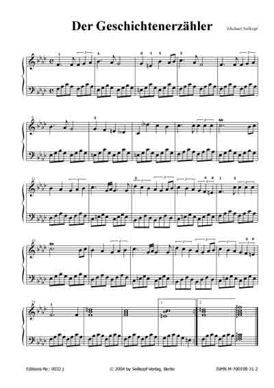 Geschichtenerzähler (aus: "15 kleine Klavierereien") Dieses Stück ist sehr gut geeignet, um sich mal an Tonarten mit "mehreren" Vorzeichen heranzuwagen (f-moll). Auch wird das Spiel von Achteln (linke Hand) gegen Viertel-Triolen (rechten Hand) geübt. [für leicht Fortgeschrittene; 1 Seite; von Michael Seilkopf] |